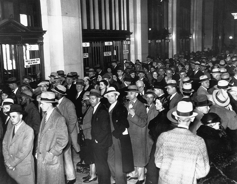 Thousands of people stand in line to receive 30% of their deposits during the National Banking Emergency of 1933. (Credit: Bettmann/Getty Images)