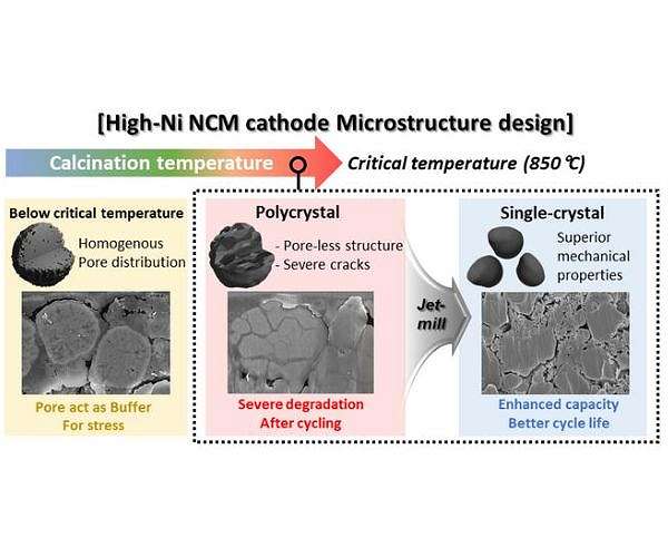 To overcome this limitation, the researchers developed a method to produce nickel-based cathode materials in a “single-crystal” form. These single crystals are synthesized as large particles, enhancing their structural and chemical stability and durability. While it is known that single-crystal materials are hardened at high temperatures, the specifics of this process and the conditions required were previously unclear.