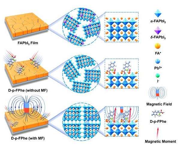 At the forefront of this research is Prof. Wang’s group from Soochow University, who have introduced a novel method for manipulating the crystal orientation of metal halide perovskites. Their approach involves using chiral molecules to establish a quantified strong force with formamidine (FA) ions in the perovskite, known as the magnetic dipole moment. This method addresses a critical issue in conventional perovskite film crystallization, where the production of a phase harmful to the device, termed the ‘d phase,’ is inevitable.