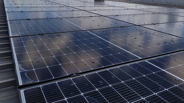 Closeup of photovoltaic panels on a rooftop. Installing photovoltaic modules on a rooftop.