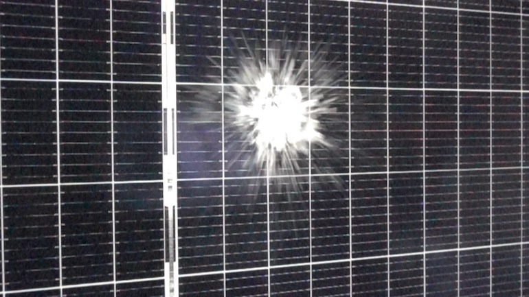 Hail strikes a solar module during PVEL’s hail stress sequence, a test in PVEL’s PV Module Product Qualification Program (PQP).