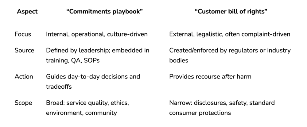 A bill of rights is valuable as a safety net, but it’s reactive by design and will always be a step behind. Commitments or promises are proactive: They prevent problems, reduce cancellations and build trust before a complaint exists. In several states, consumer-protection guides and disclosures already function as a regulatory “bill of rights.” Companies that go further by defining and operationalizing their own commitments control the experience, not just their compliance.
