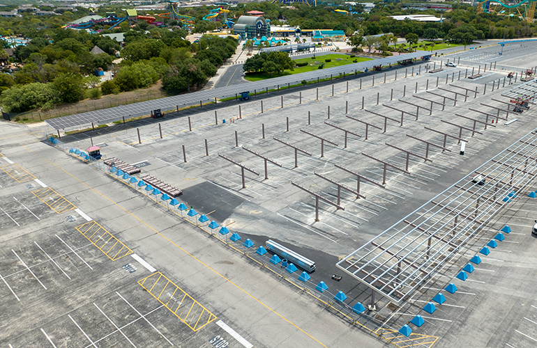 SeaWorld San Antonio, in partnership with Pivot Energy announced the beginning stages of the installation of a 4.3-MW solar parking lot canopy. This project will not only provide shade to visitors during extreme heat but will also help SeaWorld make significant strides toward a more sustainable future.